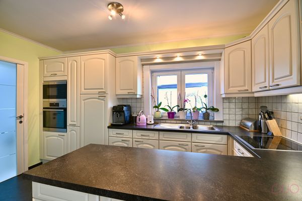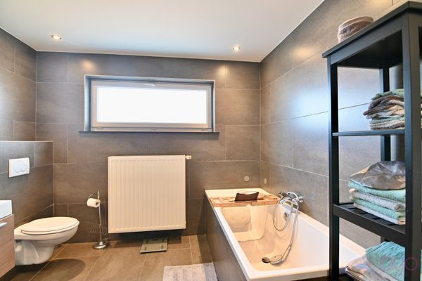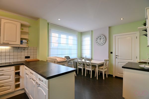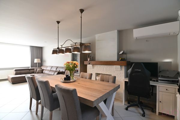 We betreden de woning in de ruime inkomhal met vestiairehoek en toegang tot de kelderberging. Deze centrale hal vormt de koppeling tussen de leefruimten alsook de bovenverdieping. De leefruimte, voorzien van eetkamer en zithoek, is zeer lichtrijk en is uitgerust met airconditioning. De open, hoogwaardig afgewerkte keuken ligt aansluitend en is volledig geïnstalleerd. Deze beschikt over nieuwe, kwalitatieve toestellen, zoals een AEG heteluchtoven, een AEG microgolfoven, een AEG koelkast, een keramische kookplaat van AEG, en een dubbele spoelbak met afdruipzone voorzien van een gelamineerd werkblad en tegelspatwand. De afwasmachine bevindt zich ingebouwd in de kitchenette van de wasplaats/berging. Een afgewerkte, verwarmde en lichtrijke tuinkamer zorgt voor de connectie met het gastentoilet alsook met de wasplaats, en het ingesloten terras. Deze veranda kan perfect dienst doen als bureel of speelruimte.
