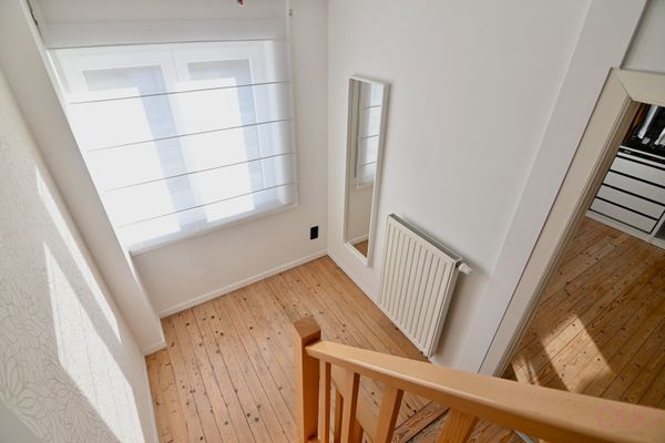 Op de eerste verdieping beschikt de woning over twee slaapkamers, een volledig ingerichte badkamer en nachthal. De badkamer is volledige vernieuwd en uitgerust met een inloopdouche, dubbele lavabo, een toilet en een ligbad. De vaste trap naar de zolderverdieping brengt ons in de master bedroom met ingebouwde kasten, airconditioning alsook inclusief alle voorzieningen voor een tweede volwaardige douchekamer.
