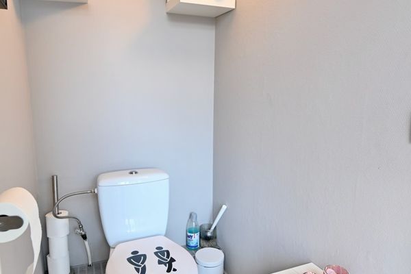 Keramische tegelvloer, dubbele lavabo, toilet, ventilatieraam