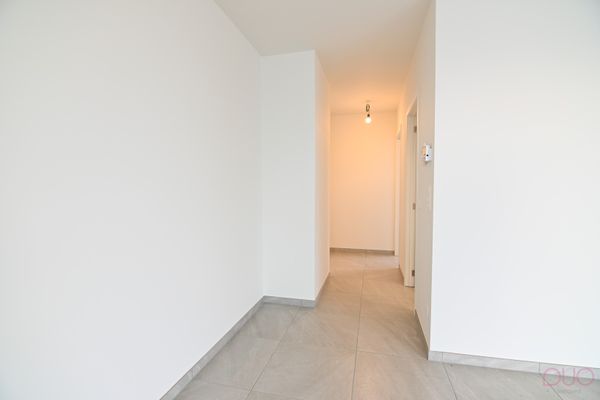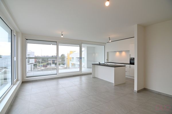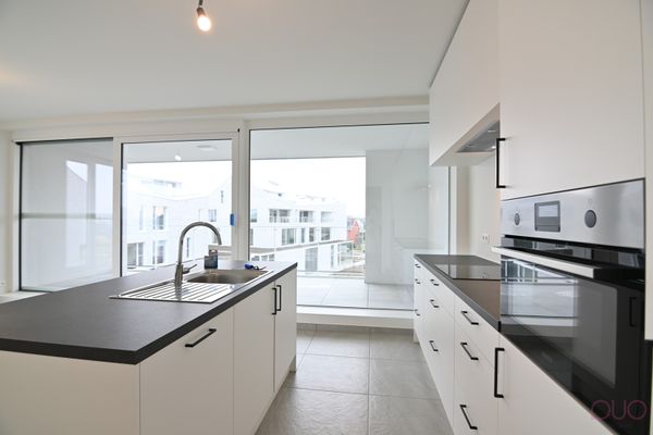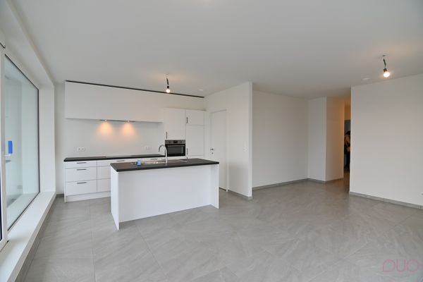 De centrale inkomhal geeft toegang tot alle woon- en slaapvertrekken. Aan de voorzijde van het appartement bevindt zich een ruime leefruimte met aansluitend open keuken en toegang tot het inpandig terras. De keuken is volledig uitgerust met een combi-oven, een inductiekookplaat, dampkap, een afwasmachine, een spoelbak alsook een ingebouwde koelkast. Aan de keuken bevindt zich de berging/technische ruimte waar aansluiting voor wasmachine en droogkast voorzien werd