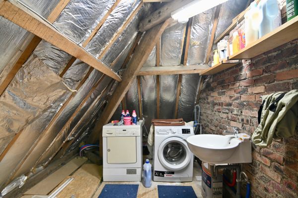 De bovenverdieping telt drie grote slaapkamers, een nachthal en een badkamer. Op de tweede verdieping vinden we een ruime zolder, bereikbaar via vaste trap, die extra opbergruimte én zelfs uitbreidingsmogelijkheden biedt. Op deze verdieping vinden we ook de washoek, met aansluitingen voor wasmachine en droogkast.