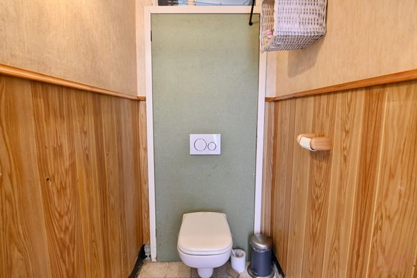 Tegelvloer, ventilatieraam, lavabo, Van Marcke boiler, toegang naar zolder