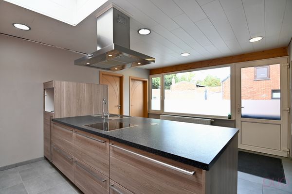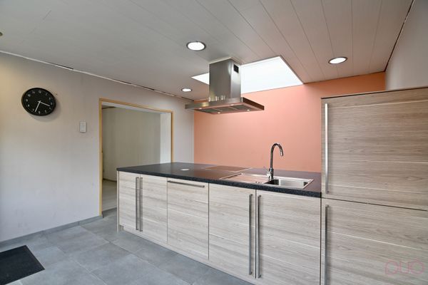 Keramische tegelvloer, HR-glas en pvc raamwerk met vliegenraam deur, werkeiland met gelamineerd werkblad, spoelbak met druiprekje, ingebouwd keramisch kookvuur, dampkap (Zanussi), afwasmachine (Zanussi), ingebouwd stopcontactpunt, koepel