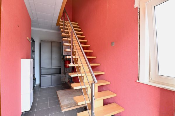 Laminaat, PVC-raam, vaste trap met inox-leuning