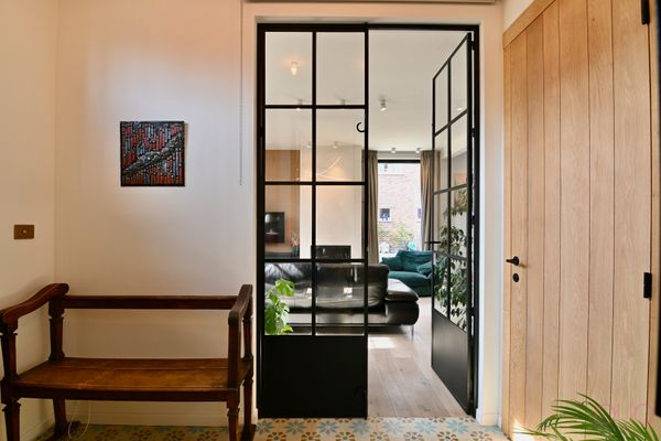 Bij het betreden van de woning komt u in een ruime en lichtrijke inkomhal, waar elegante stalen deuren (ARTHUR BOURS) en eiken deuren (KOVA) meteen de toon zetten van de verdere inrichting. Vanuit deze centrale hal bereikt u rechts een volledig ingerichte bureau- of praktijkruimte met maatkasten, centraal het gastentoilet en links de leefruimte. De leefruimte straalt warmte en gezelligheid uit dankzij de parketvloer en bestaat uit een ruime zithoek met gashaard (GHYSENS), naadloos overgaand in de eetkamer en open keuken. Deze keuken, met zicht op de tuin, is een echte blikvanger en werd op maat vervaardigd in vol hout en natuursteen. Ze is uitgerust met kwalitatieve toestellen, waaronder een fornuis van Lacanche met inductiekookplaat en meerdere ovens, een koelkast van ATAG, een vaatwasser van Miele, een dampkap van Novy en een geïntegreerde spoelbak. De keuken is bovendien ergonomisch ingericht met tal van praktische opbergmogelijkheden en ladekasten.
