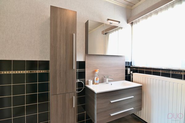 Tegelvloer, tegelspatwand, lavabomeubel, spiegelkast boven lavabomeubel, toilet, douchebak, manuele rolluiken