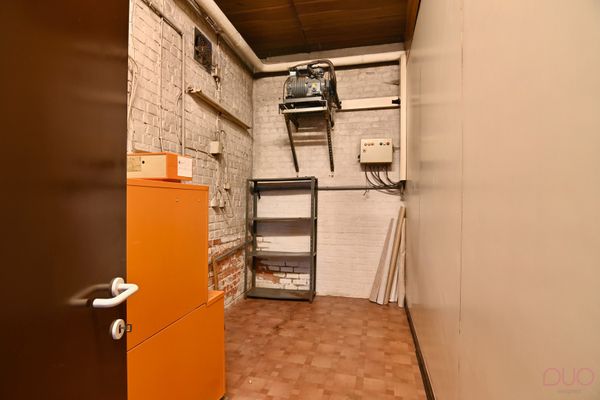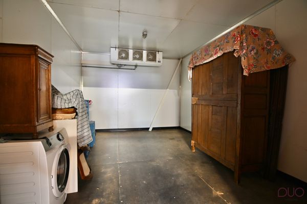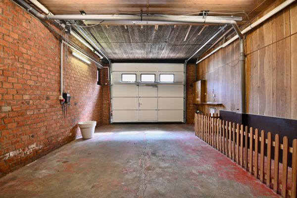 Het perceel werd volledig bebouwd in 1969. Het gelijkvloers is volledig ingericht als garage, eveneens toegankelijk met grote camionettes. De grote sectionale poort is recent vernieuwd en uitgerust met een nieuwe motor. Er werd een deur voorzien in het poortpaneel. Achteraan de garage staat een grote, nog werkzame koelcel van ca. 16m2. Alsook vinden we er een technische berging met de stookolietank en stookolieketel. Deze ruimte kan aldus fungeren als garage, maar eveneens als opbergruimte, stockageruimte of eventueel zelfs werkplaats.