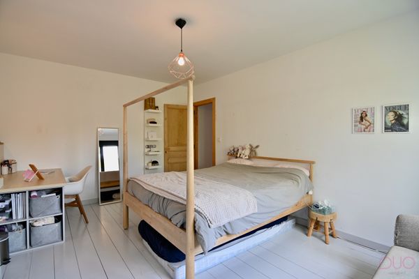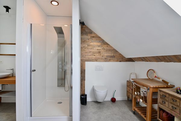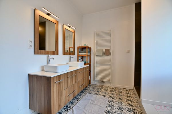 Op de eerste verdieping vindt men vanuit de nachthal, vier ruime, instapklare slaapkamers met oppervlaktes die variëren tussen 14m² en 20m². We vinden er eveneens een volledig afgewerkte badkamer met douche, een vrijstaand bad en een lavabomeubel. Het toilet is afzonderlijk voorzien.