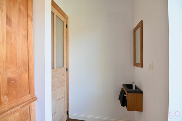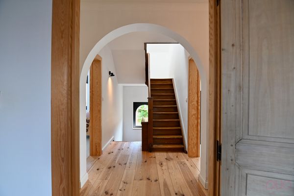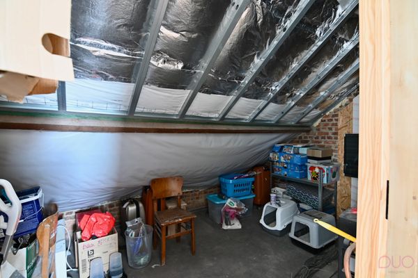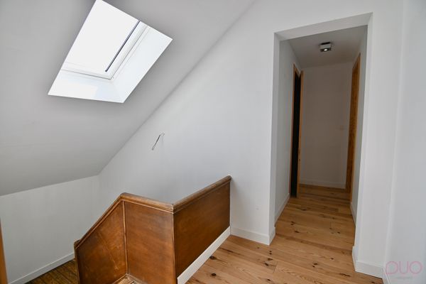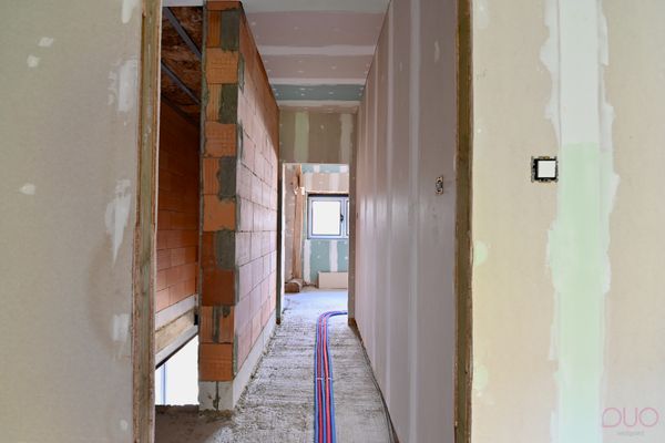 Tegelvloer, aluminium voordeur met driedubbel glas, houten trap, omkast: omvormer, Proximus-modem, verdeelbord elektriciteit