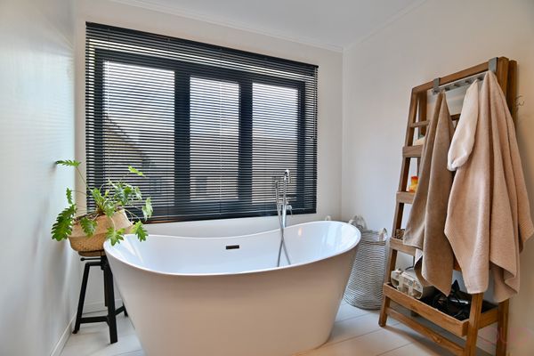 Tegelvloer, aluminium raamprofielen met lamellen, badkuip (losstaand), dubbele lavabomeubel, douche met tegelspatwand