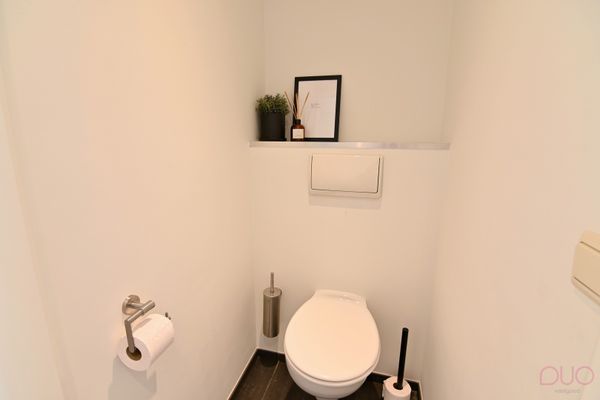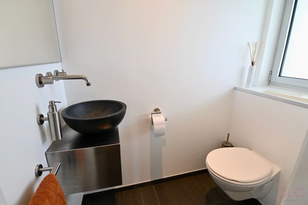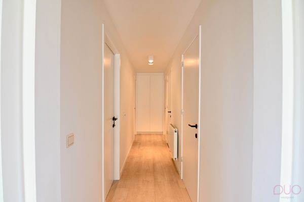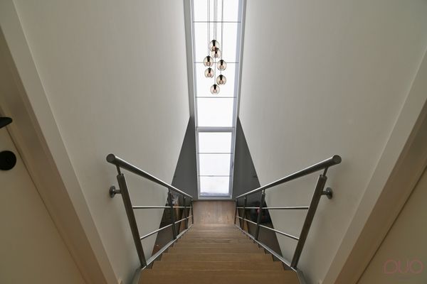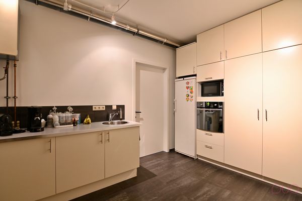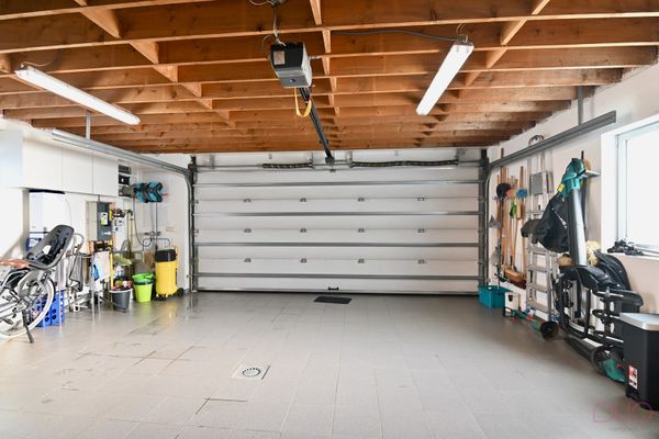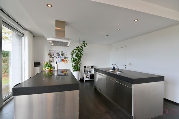 Aan de andere zijde van de living bevindt zich de moderne, volledig uitgeruste keuken, afgewerkt met high-end materialen zoals inox en natuursteen. Ze werd voorzien van alle comfort voor de echte kookliefhebber. Aansluitend vind je de praktische bijkeuken met een volledige kastenwand en alle technische installaties netjes weggewerkt. Via de zij-ingang, die eveneens dienst doet als vestiaire en sas achter de berging, bereik je de ruime dubbele garage.