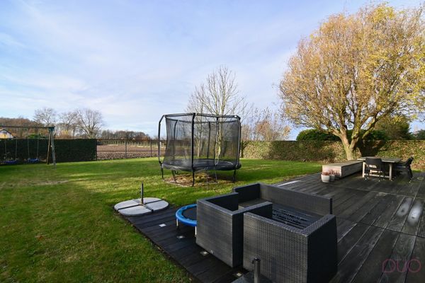 Buiten geniet je achteraan van een ruim zonneterras met zonneluifel over de volledige breedte van de woning. De netjes onderhouden tuin biedt uitzicht over het achterliggend agrarisch gebied, waardoor rust en privacy verzekerd zijn. Aan de zijkant van de woning bevindt zich bovendien een bijkomend zonneterras, ideaal om op elk moment van de dag van de zon te genieten.