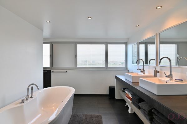 De stijlvolle open trap brengt je naar de bovenverdieping, waar maar liefst vijf volwaardige ruime slaapkamers op je wachten. De moderne badkamer is uitgerust met een vrijstaand ligbad, een inloopdouche en dubbel lavabomeubel.