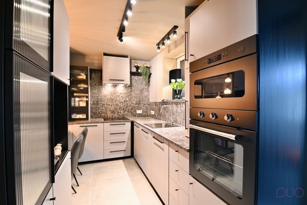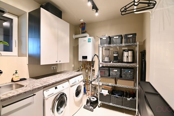 Bij het binnenkomen betreden we de gezellige woonkamer met aansluitend de open keuken. Een vaste eettafel nodigt uit om samen te tafelen. Zetel, tapijt en salontafel werden specifiek gekozen om perfect in het interieur te passen en blijven integraal behouden. Aansluitend bevindt zich de praktische bijkeuken met aansluitingen voor wasmachine en droogkast. Hier komt ook reeds de bekabeling toe voor wie in de toekomst zonnepanelen wenst te plaatsen.