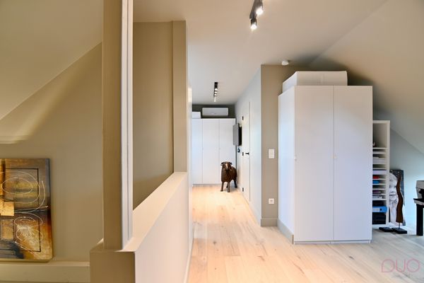 Verder vinden we op het gelijkvloers, de nacht- en traphal met ingebouwde kasten en een apart, stijlvol toilet. Via de natuurstenen trap bereiken we de open verdieping, waar momenteel een ruim bureel en een open slaapkamer zijn ingericht. Alle meubels – bureau, stoelen, bed en kasten – maken deel uit van de verkoop. Indien gewenst kan eenvoudig een tweede slaapkamer gecreëerd worden door het voorzien van een gang met deur, waarbij de huidige bureau volledig als slaapkamer kan worden ingericht. Aansluitend aan de slaapkamer bevindt zich de smaakvol, ingerichte badkamer met inloopdouche en dubbele lavabo.