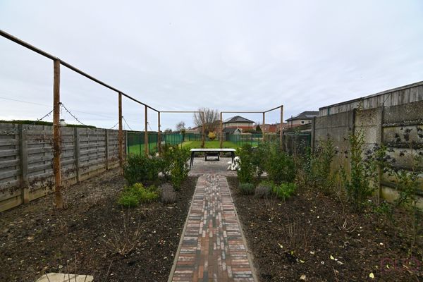 Achteraan de woning bevindt zich een prachtige veranda waarin een ruime eettafel met stoelen is voorzien. De gehele glazen wand met zicht naar de tuin kan opengeschoven worden. De ingemaakte kasten en de buitenkeuken blijven volledig behouden. Verder is er een buitenberging, waar ook de pomp van de regenwaterput is ondergebracht. De tuin is volledig aangelegd en omheind. Het geheel is voorzien van verlichting en een tuintafel met stoelen. Indien gewenst kan achteraan nog een bijkomend tuinhuis geplaatst worden.
