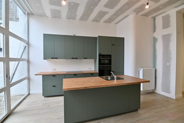 Keramische parkettegel, gelamineerd werkblad, inductie kookvuur (Siemens), heteluchtoven en combi-oven (Siemens), dampkap, ingebouwde frigo, afwasmachine (Siemens), raampartij met deur naar buiten, digitale thermostaat