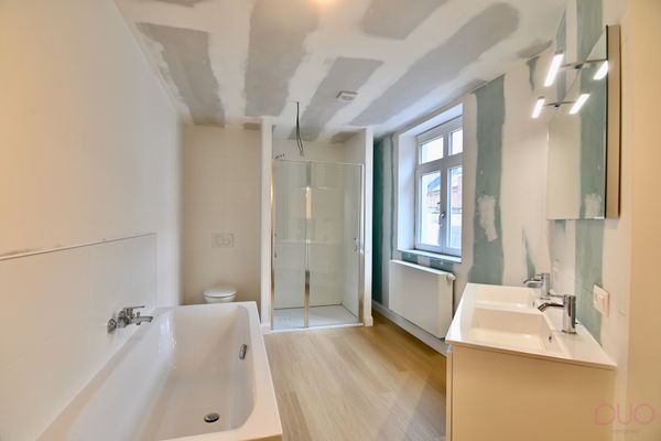 Laminaatvloer, dubbel lavabomeubel, douche, hangtoilet, ligbad, elektrische afzuiging.