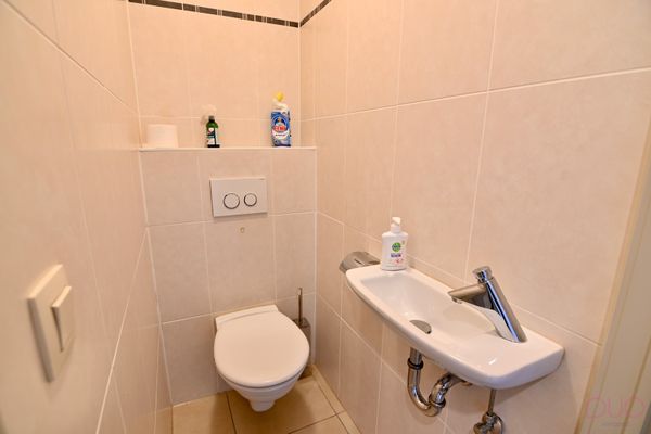 De centrale inkomhal biedt toegang tot alle ruimtes. Aan de voorzijde bevindt zich de lichte en gezellige leefruimte met aansluitend een moderne keuken die volledig is uitgerust met alle nodige toestellen: een inductiekookplaat, combi-oven, dampkap, spoelbak, koelkast en vaatwasser. Via de keuken bereikt u een praktische berging, voorzien van aansluiting voor wasmachine en droogkast.