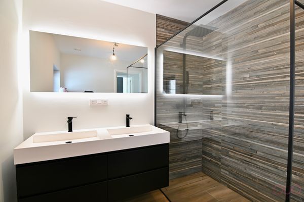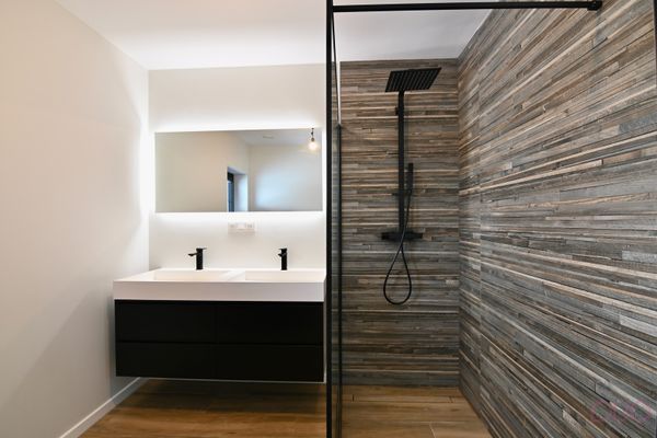 Op de eerste verdieping vinden we een nachthal en drie ruime slaapkamers. Verder treffen we er een badkamer met dubbel lavabomeubel en een ruime inloopdouche én een apart toilet. De zolderverdieping is toegankelijk via een trapluik in de slaapkamer en kan dienst doen als extra opbergruimte. Mits aanpassingen kan men deze zolderruimte nog herinrichten.