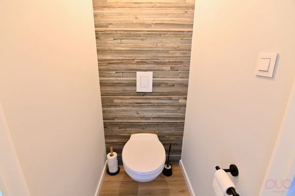 Tegelvloer, tegelwand, hangtoilet, pompbakje, ventilatie