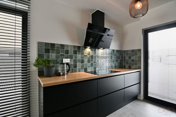 Tegelvloer, tegelspatwand, inductiekookplaat (Zanussi), dampkap (Elica), pompbak met druiprekje, afwasmachine (Zanussi), microgolfoven en heteluchtoven (Zanussi)