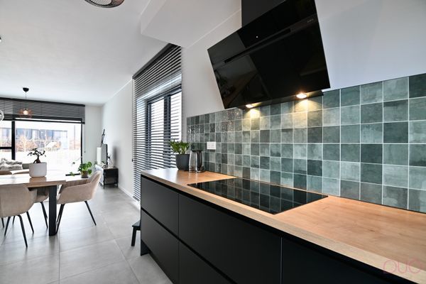 We betreden de woning via de inkomhal met opbergmogelijkheden. Deze geeft links toegang tot het gastentoilet. Wanneer we verder wandelen, komen we in de ruime living met open keuken. Dankzij de grote raampartijen en het grote schuifraam aan tuinzijde, is deze ruimte zeer lichtrijk. De open keuken is volledig uitgerust met een ingebouwde koelkast, een dampkap, een afwasmachine, een heteluchtoven, een microgolfoven en een inductiekookplaat. Ze werd degelijk afgewerkt met een houten werkblad met een spoelbak voorzien van een afdruipzijde. In aansluiting met de leefruimte treffen we de grote wasplaats/berging voorzien van aansluitingen voor wasmachine en droogkast, alsook een uitgietbak. De CV-installatie is hier eveneens geïnstalleerd. De tuin en het terras zijn rechtstreeks bereikbaar via de achterdeur in de wasplaats of via het grote schuifraam in de leefruimte. De ruime garage bevindt zich aan de straatzijde, vlak langs de wasplaats.