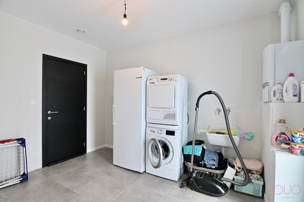Tegelvloer, achterdeur naar terras, aansluiting wasmachine en droogkast, pompbakje, CV-ketel (Vaillant), ventilatie