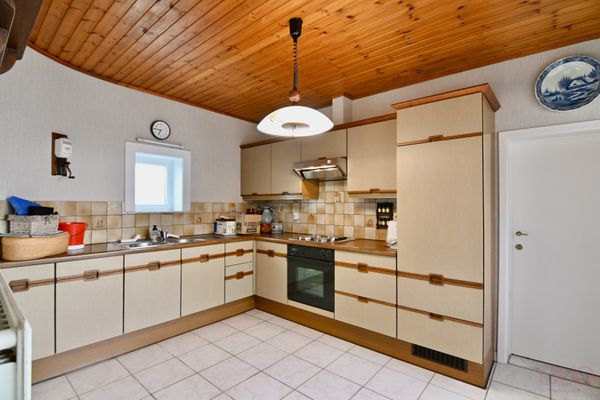 Keramische tegelvloer, gelamineerd aanrecht, dubbele spoelbak met druiprekje, dampkap (Novy), oven (Zanussi), elektrische kookplaat (Zanussi), ingebouwde frigo