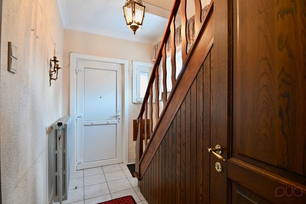 Keramische tegelvloer, PVC-deur en PVC-raam, houten trap