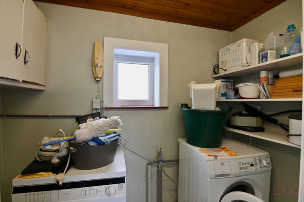 Keramische tegelvloer, wandkasten, aansluiting wasmachine en droogkast, ventilatieraam