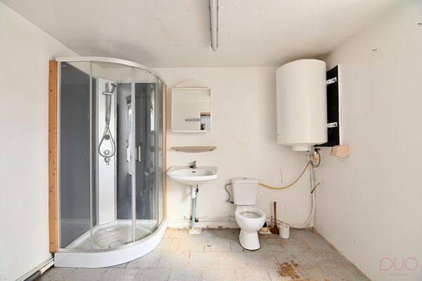 Tegelvloer, douchecabine, lavabo, boiler op elektriciteit