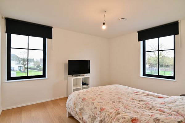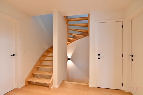Op de eerste verdieping, bereikbaar via de traphal (trap = rubberwood) afgesloten met een schuifdeur, geeft de nachthal toegang tot drie volwaardige en ruime slaapkamers. De grootste slaapkamer leent zich om een ingebouwde dressing te creëren. Daarnaast is er een apart toilet en een volledig ingerichte badkamer, uitgerust met een ligbad, een inloopdouche en een houten lavabomeubel met natuurstenen blad en wandspiegel. De zolderverdieping herbergt een vierde zolderkamer die nog verder afgewerkt kan worden. Deze verdieping biedt bovendien de mogelijkheid om bijkomend in te delen naar wens, bijvoorbeeld in een zolderberging en twee extra slaapkamers.