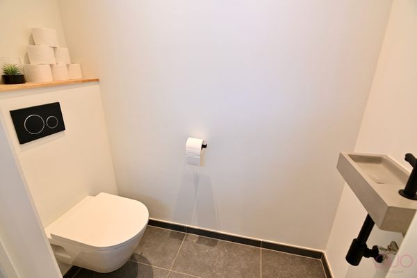 Bij het betreden van de woning komt u binnen in de inkomhal, die toegang biedt tot het gastentoilet en de leefruimte. De ruime en lichtrijke living vormt samen met de open keuken het hart van de woning. Dankzij de open indeling geniet u hier van een aangename woonbeleving met zicht op de tuin. Aansluitend bevindt zich een praktische bureauhoek, ideaal voor thuiswerk. Verder is er op het gelijkvloers nog een aparte wasplaats/berging voorzien met alle nodige aansluiting voor wasmachine en droogkast, een uitgiet-meubel alsook de warmtepomp en regenwaterpomp. De keuken is volledig ingericht en voorzien van kwalitatieve toestellen en een keramisch werkblad: een dubbele spoelbak, XXL-koelkast (SIEMENS), afwasmachine (SIEMENS), microgolfoven (SIEMENS), heteluchtoven (SIEMENS), en een gecombineerde inductiekookplaat met automatische dampkap (AEG).