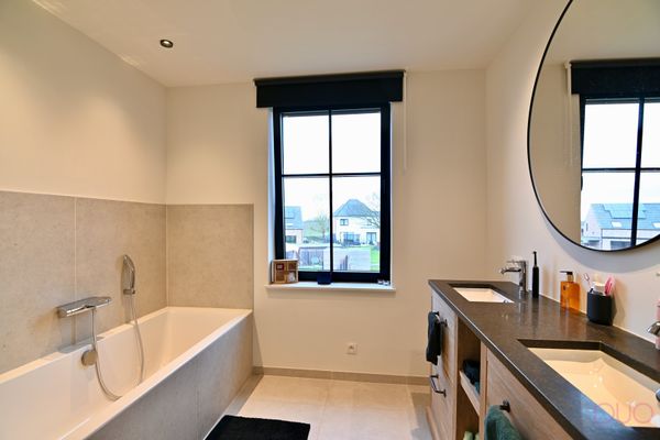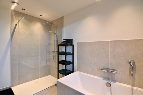 Tegelvloer, dubbele lavabo (hout met natuursteen), ligbad, inloopdouche