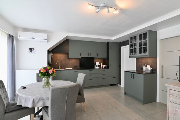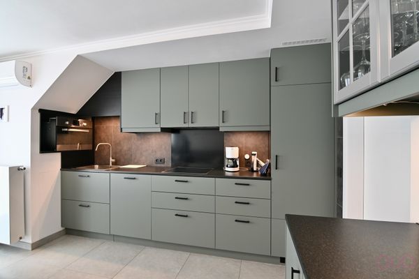 Het hart van het appartement is de lichtrijke living met open, volledig vernieuwde keuken - een moderne, stijlvolle ruimte met voldoende plaats voor zowel een gezellige zithoek als een eettafel. De aangrenzende bijkeuken biedt praktische opbergruimte én voorziet een vaste plaats voor de wasmachine en droogkast.
