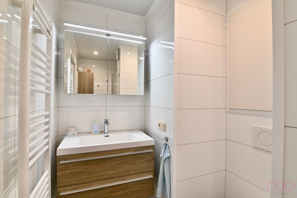 Het appartement beschikt over twee slaapkamers: een grote en een kleinere, die ook perfect dienst doet als thuiskantoor of dressing. De gemoderniseerde badkamer is voorzien van douche, WC en lavabo.