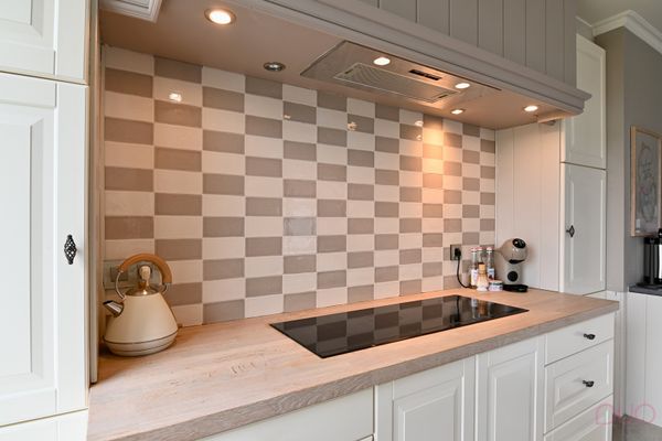 tegel, ingerichte bijkeuken met toestellen, combi oven, inductievuur met dampkap, spoelbak met kraan