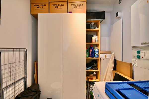 Natuurstenen tegelvloer, verdeelbord, telenet modem, ventilatie, cv-ketel (Vaillant), aansluiting wasmachine en droogkast