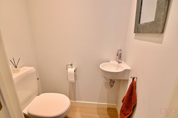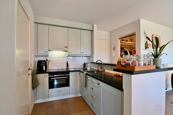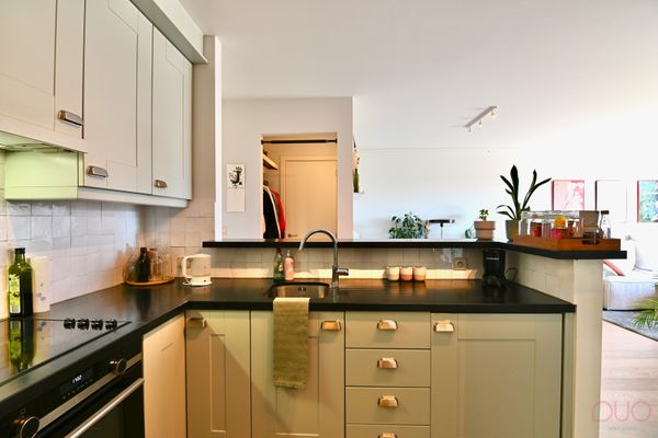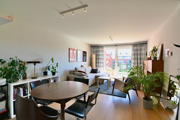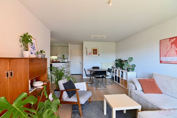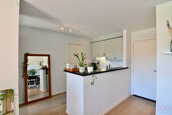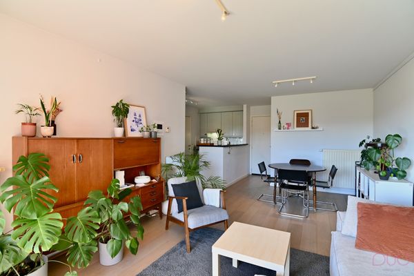 Het appartement, gelegen op de tweede verdieping, verwelkomt je met een aangenaam gevoel van ruimte en licht. Via de inkomhal, uitgerust met vestiaire en apart gastentoilet, kom je in de open leefruimte voorzien van een knappe parketvloer. Deze bestaat uit een gezellige zithoek, eethoek en een volledig geïnstalleerde open keuken. De keuken, voorzien van een natuurstenen blad, is uitgerust met een keramische kookplaat, een combi-oven, een dampkap, alsook een koelkast en spoelbak. Aansluitend bevindt zich een praktische berging met aansluitingen voor wasmachine en droogkast, alsook de centrale verwarming op aardgas en nutsvoorzieningen.