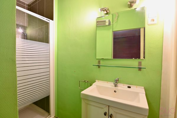 Tegelvloer, lavabomeubel, douche, aansluiting wasmachine en droogkast, elektrische verwarming