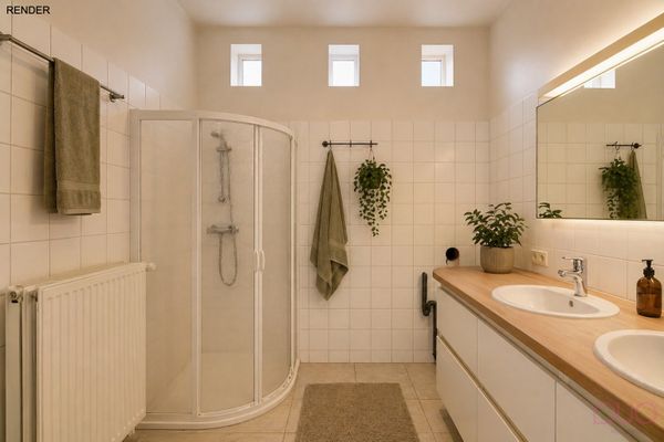 Keramische tegelvloer, tegelwand, dubbele lavabo, toilet, douchecabine, elektrische ventilatie, aansluiting voor wamachine